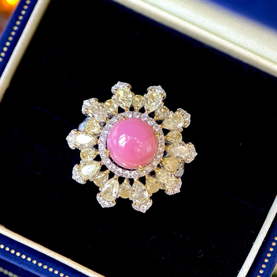 A masterpiece of nature and craftsmanship, this exquisite ring features a 3.66-carat flamingo pink conch pearl, celebrated for its high porcelain luster, silky flame patterns, and saturated hue. Nestled in an 18K gold setting, the pearl is accented by 1.87 carats of natural fancy yellow diamonds and 0.69 carats of brilliant white diamonds, creating a dazzling contrast.